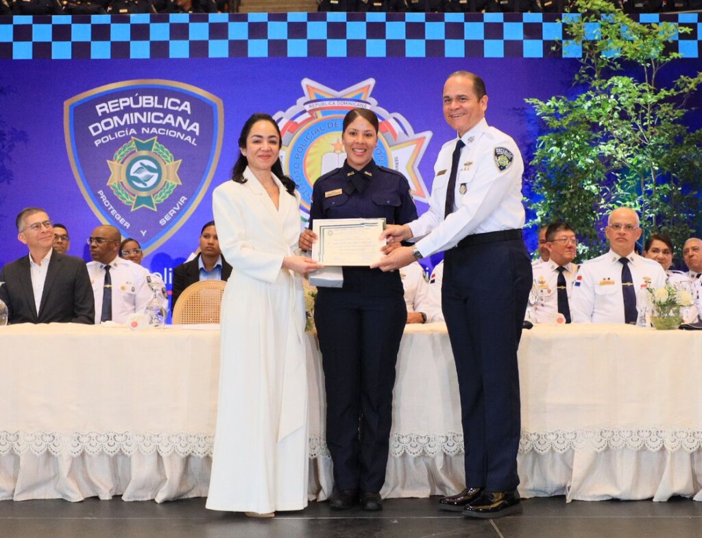La ministra de Interior y Policía, Faride Raful, encabezó el acto junto al director general de la Policía Nacional, mayor general Andrés Modesto Cruz Cruz, y la directora de la Escuela de Entrenamiento Policial, coronel Alexandra Familia Acevedo.