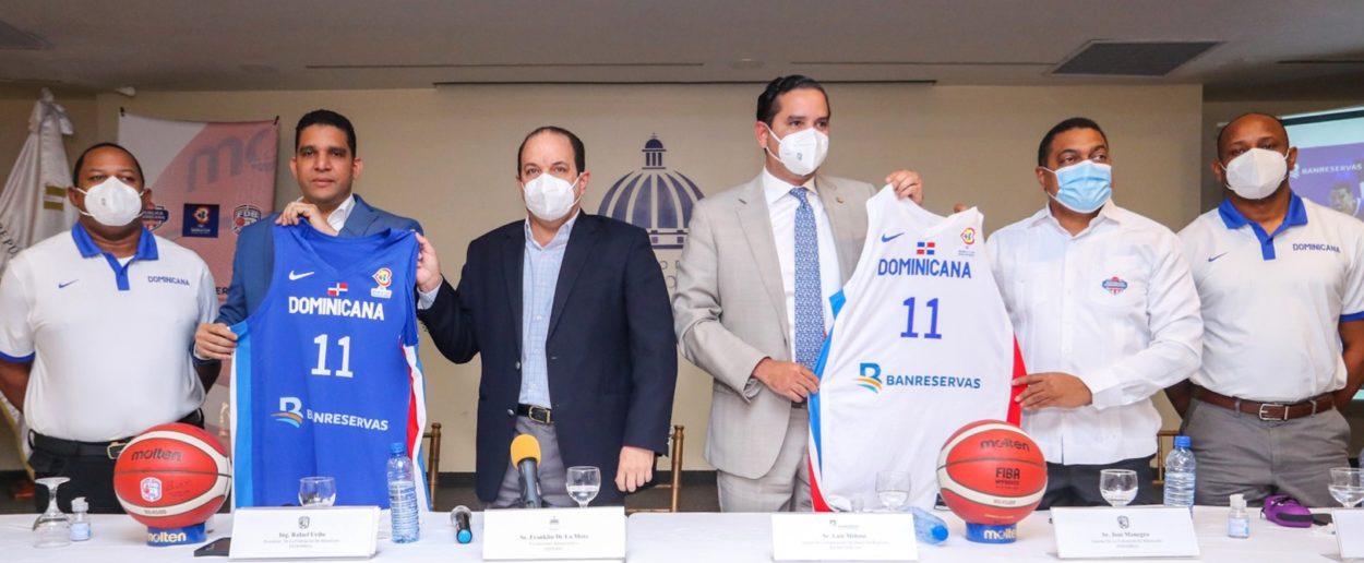 Rafael Uribe, presidente de FEDOMBAL, José Monegro, gerente de la Selección de Baloncesto y Luis Miñoso, asesor del Banreservas, presentan la franela que usará el equipo nacional en la Segunda Ventana del Clasificatorio al Mundial de Baloncesto. Estuvieron acompañados de Melvyn López, Franklin De la Mota, viceministro de Deportes y José -Maíta- Mercedes.
