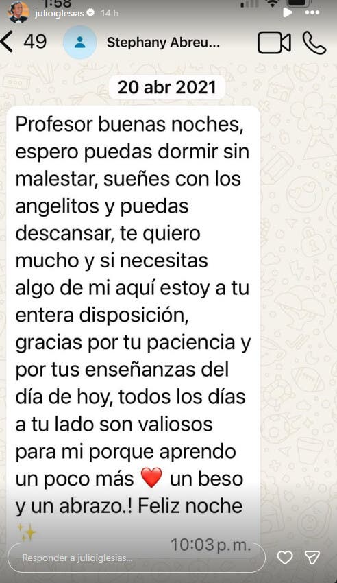 En uno de los mensajes del 20 de abril de 2021 que atribuye a sus trabajadores se lee: «Profesor buenas noches, espero puedas dormir sin malestar, sueñes con los angelitos y puedas descansar, te quiero mucho y si necesitas algo de mi aquí estoy a tu entera disposición, gracias por tu paciencia y tus enseñanzas del día de hoy, todos los días a tu lado son valiosos para mi porque aprendo un poco más (añade un corazón) un beso y un abrazo!. Feliz noche».