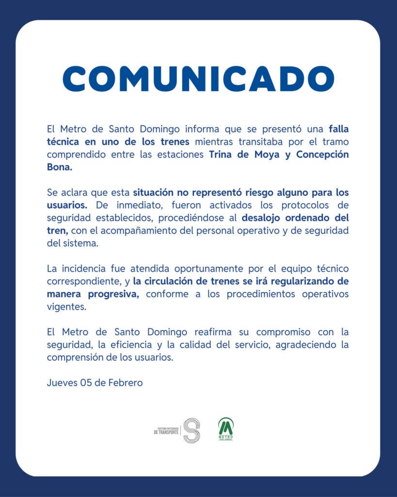 La Oficina para el Reordenamiento del Transporte (Opret) informó que la incidencia se produjo en uno de los trenes mientras transitaba entre las estaciones Trina de Moya y Concepción Bona , lo que obligó a suspender temporalmente la circulación por aproximadamente una hora.
