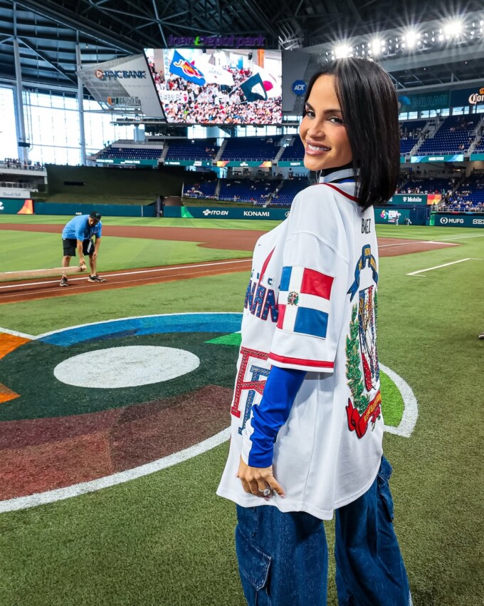Con Vladimir Guerrero Jr. como cátcher, Natalia Alexandra Gutiérrez Batista, nombre real de la artista, se presentó luciendo una chaqueta con símbolos y colores representativos de su país, en el partido disputado en el LoanDepot Park, en Miami, Florida.