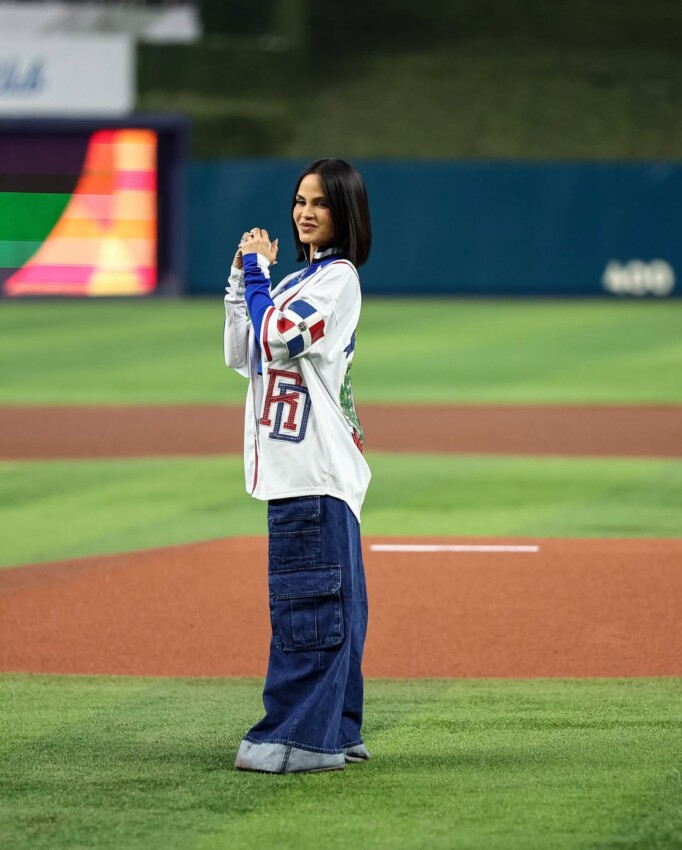 La cantante dominicana Natti Natasha realizó este lunes el lanzamiento ceremonial previo al partido entre República Dominicana e Israel en el Clásico Mundial de Béisbol.