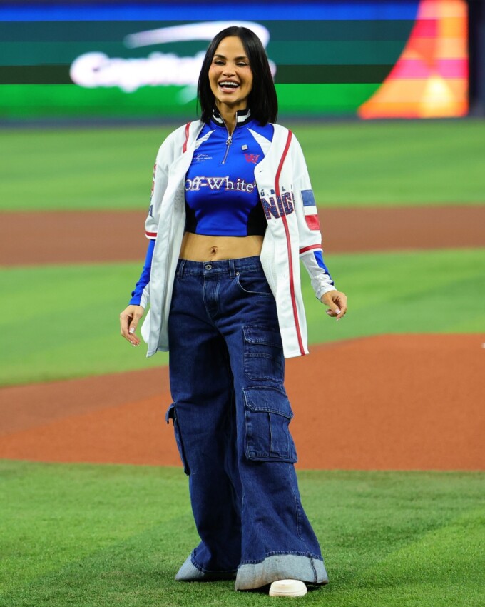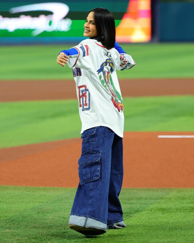 Con Vladimir Guerrero Jr. como cátcher, Natalia Alexandra Gutiérrez Batista, nombre real de la artista, se presentó luciendo una chaqueta con símbolos y colores representativos de su país, en el partido disputado en el LoanDepot Park, en Miami, Florida.