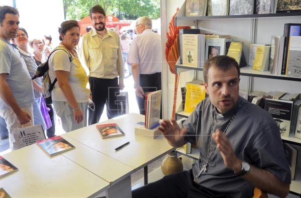 El entonces obispo de Solsona, Xavier Novell (d), firma ejemplares de su obra "Carta a los Jóvenes" durante la Feria del Libro de Madrid, en una fotografía de archivo. EFE/Kiko Huesca