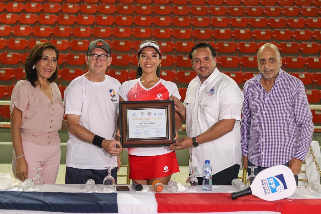 Miranda Cabieses, (centro) quien es embajadora mundial de la Federación Internacional de Pickleball, es reconocida por Elvys Duarte y Omar Cruz, por su esfuerzo en enseñar y ayudar a la difusión del Pickleball como disciplina deportiva en la República Dominicana. En los extremos, izquierdo y derecho Maritza Gladys Barzola Vilchez de Perú y el profesor Fernando Teruel. (Fuente externa)