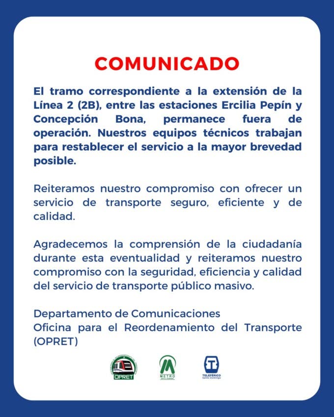 No obstante, la Opret precisó que el tramo correspondiente a la extensión de la Línea 2 (2B), entre las estaciones Ercilia Pepín y Concepción Bona, permanece fuera de operación, mientras los equipos técnicos continúan los trabajos para restablecerlo a la mayor brevedad posible.