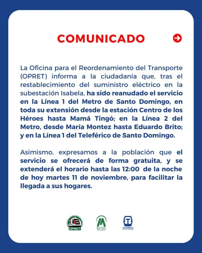 Santo Domingo.– La Oficina para el Reordenamiento del Transporte (Opret) informó que el servicio del Metro y el Teleférico de Santo Domingo fue restablecido y que se ofrecerá de manera gratuita hasta las 12:00 de la noche de este martes 11 de noviembre, para facilitar el regreso de los usuarios a sus hogares tras la interrupción eléctrica que afectó al país.