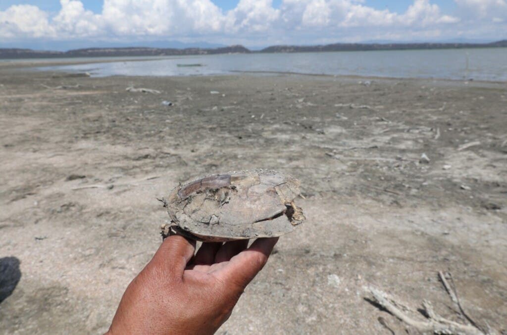 La falta de agua ha provocado que gran parte de la laguna se haya convertido en desierto, con miles de esqueletos de diferentes especies de peces.