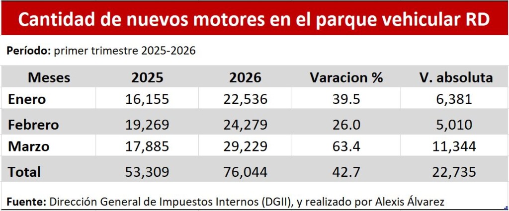 A pesar del caos que provocan los motores en las calles dominicanas, y en momentos en que el país debate una regulación eficiente de este medio de transporte, ya a marzo de 2026 ingresaron al parque vehicular 76,044 nuevas unidades, de acuerdo a datos de la Dirección General de Impuestos Internos (DGII), acelerando una tendencia que hoy desborda cualquier intento de control.