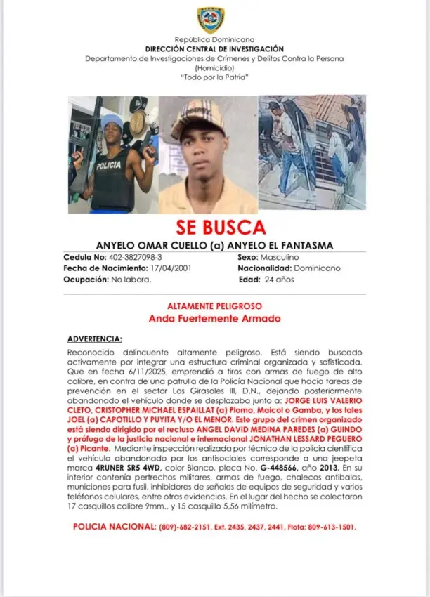Las investigaciones permitieron identificar a los ocupantes de la jeepeta como Jorge Luis Valerio Cleto; Cristopher Michael Espaillat, alias Plomo, Gamba o Maicol; Anyelo Omar Cuello, alias Anyelo el Fantasma; Joel, alias Capotillo o Puliya; y un menor cuya identidad se reserva por razones legales.
