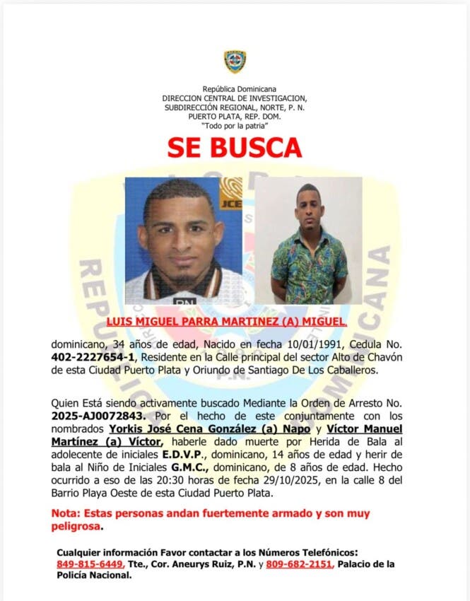 Puerto Plata, R.D. – La Policía Nacional informó que mantiene activa la búsqueda y captura de dos hombres señalados como presuntos responsables de un tiroteo en el que murió un adolescente de 14 años y resultó herido un niño de 8, hecho ocurrido la noche del pasado 29 de octubre en el sector Playa Oeste, provincia Puerto Plata.