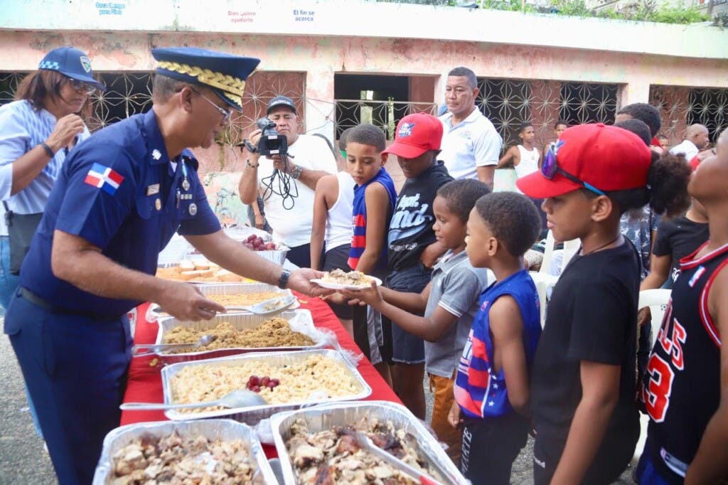 Las actividades continuaron el domingo en Las Cañitas, donde se compartió un almuerzo con niños y adolescentes de la Liga de Béisbol Futuro Marte y el Club Las Cañitas, junto al sacerdote Marcelino Mieses y los oficiales que dirigen la institución en el barrio, en un ambiente de integración, cercanía policial y diálogo directo con la comunidad.