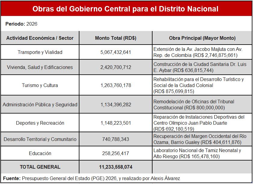 El desglose por sectores muestra que Transporte y Vialidad lidera la inversión del Gobierno, con RD$5,067,432,641, lo que representa el 45.1 % del total destinado para el Distrito Nacional.