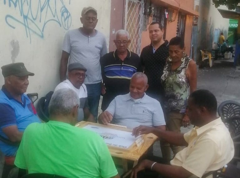 Jugadores de la Liga de Dominó José Corporán. De espaldas, Diógenes Navarro, a su izquierda, Félix Nando Báez, de frente, Domingo Agüero y, a la derecha, Mariano Mendoza.