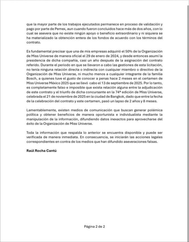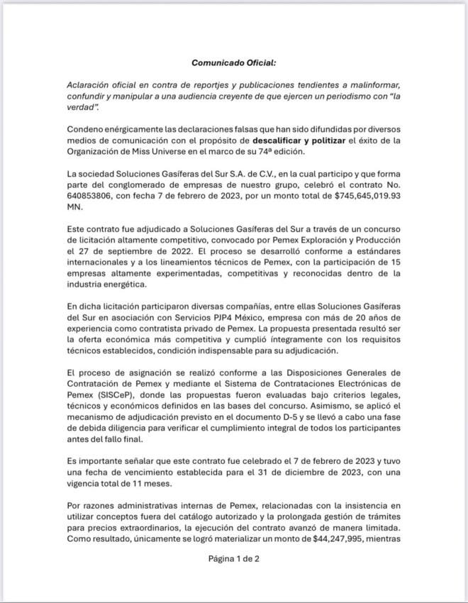 A través de Instagram, el mexicano publicó un comunicado en el que explica sus negocios con la petrolera estatal de su país, Pemex, un vínculo que ha alimentado las acusaciones de supuesto fraude en vista de que el padre de la nueva Miss Universo, Bernardo Bosch Hernández, forma parte de la directiva de la compañía energética.