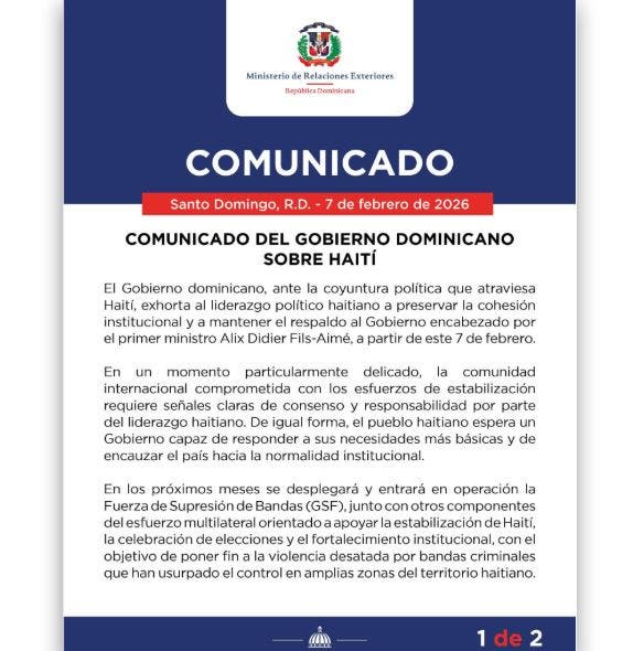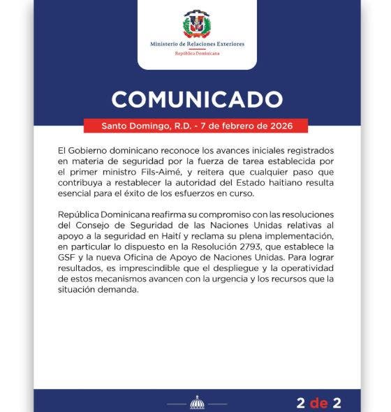 Asimismo, el Gobierno dominicano reconoció los avances iniciales registrados en materia de seguridad por la fuerza de tarea establecida por el primer ministro Fils-Aimé y reiteró que cualquier paso que contribuya a restablecer la autoridad del Estado haitiano resulta esencial para el éxito de los esfuerzos en curso.