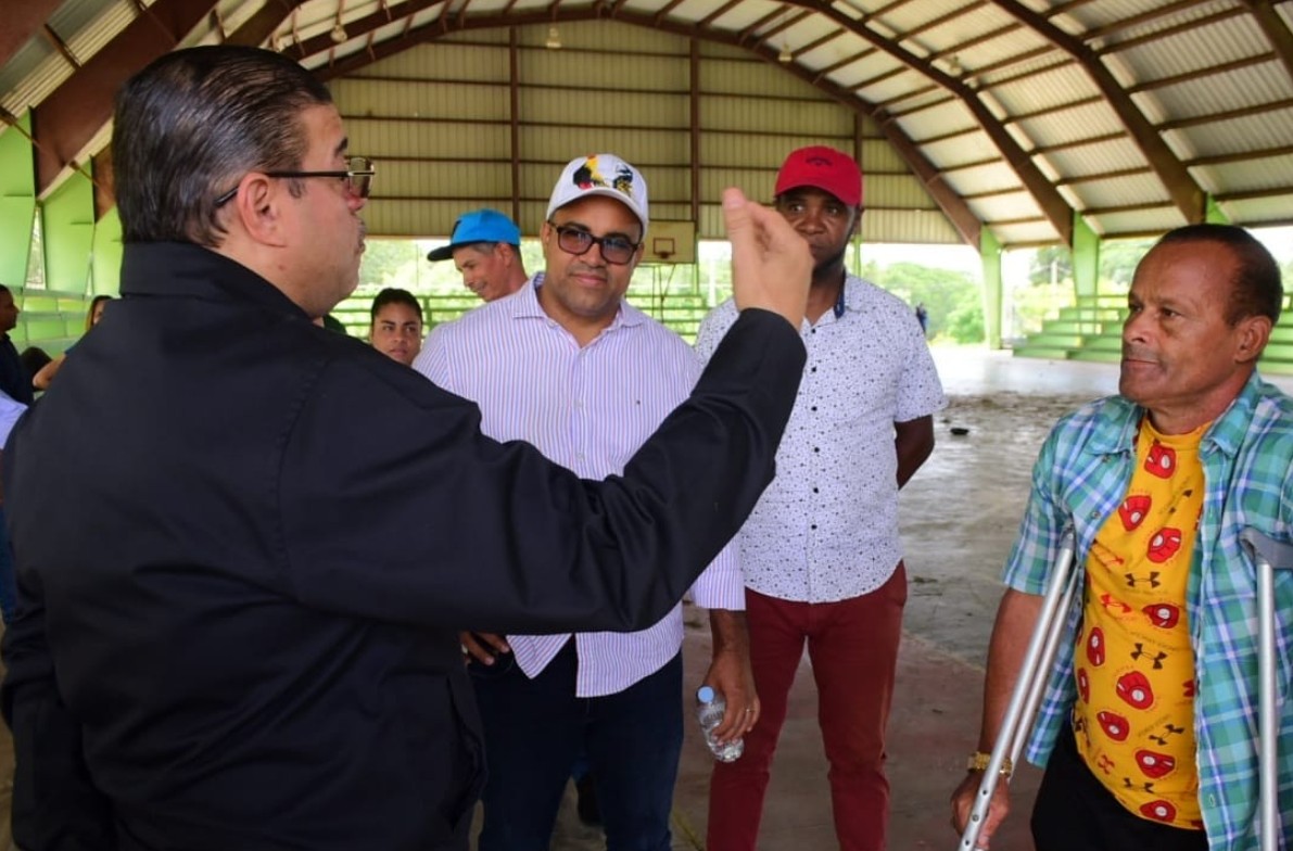 Francisco Camacho, ministro de Deportes, conversa con dirigentes deportivos de Loma de Cabrera sobre la remodelación del polideporitvo de esa ciudad.