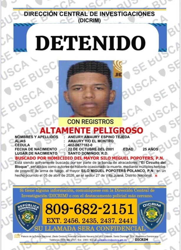 El caso está relacionado con la muerte a tiros del mayor policial Silo Miguel Popoters Polanco, de 46 años, ocurrida la madrugada del domingo en la avenida San Martín, en Villa Juana, cuando fue interceptado por varios individuos armados que presuntamente intentaron asaltarlo.