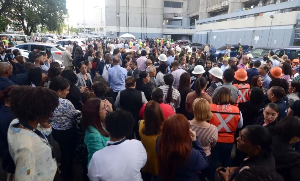 Los cientos de empleados que ocupan los 14 niveles del Huacal descendieron por las escaleras de forma pausada y siguiendo las instrucciones de los guías, identificados con chalecos lumínicos, cascos protectores, pitos y megáfonos.