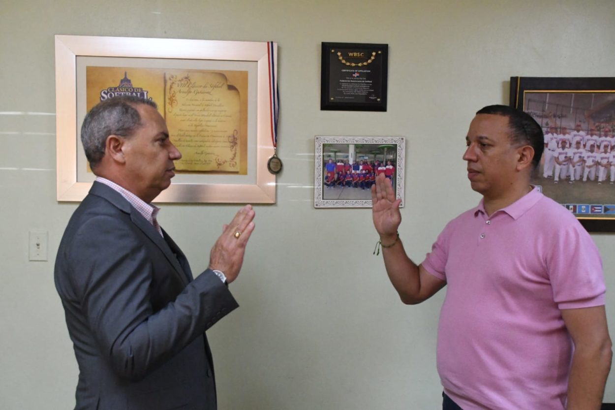 Garibaldy Bautista (izquierda), presidente de la Federación Dominicana de Softbol, juramenta a Fabio De León Sánchez como gerente general de selección nacional.