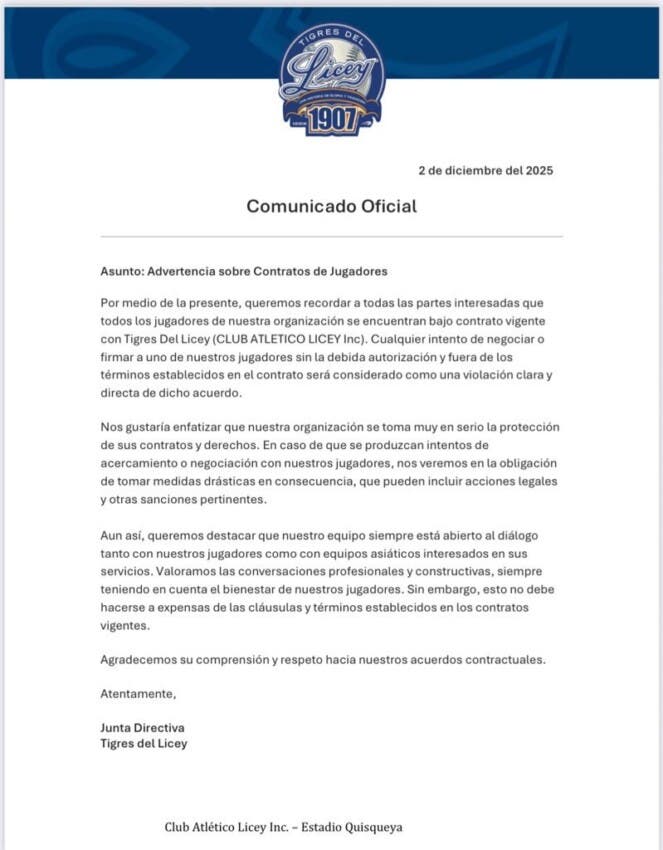 Santo Domingo.-El quipo de béisbol de los Tigres del Licey emitió este miércoles una advertencia formal dirigida a equipos, agentes y terceros, recordando que todos sus jugadores mantienen contratos vigentes y que cualquier acercamiento sin autorización constituye una violación directa a esos acuerdos.