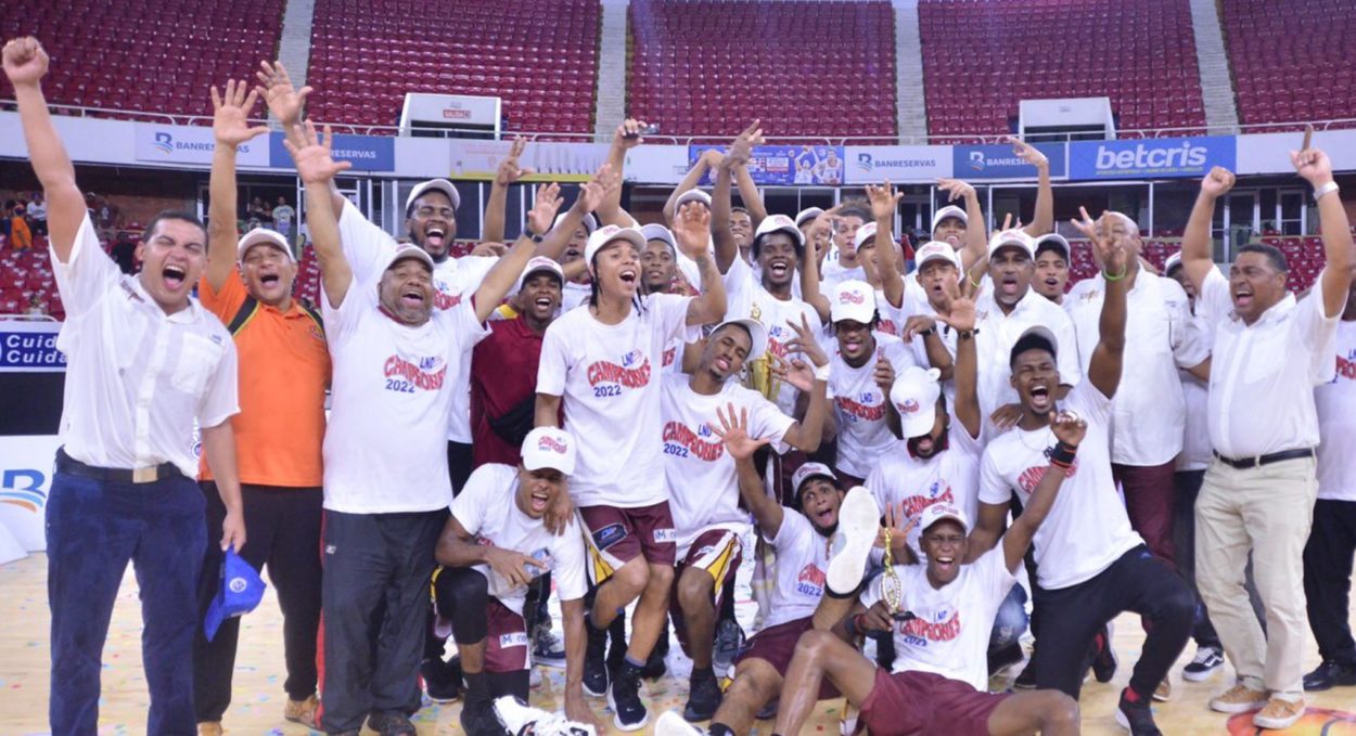 Ejecutivos, jugadores y miembros del cuerpo técnico de los Truenos del Distrito Nacional celebran la obtención del título de campeón de la LND.