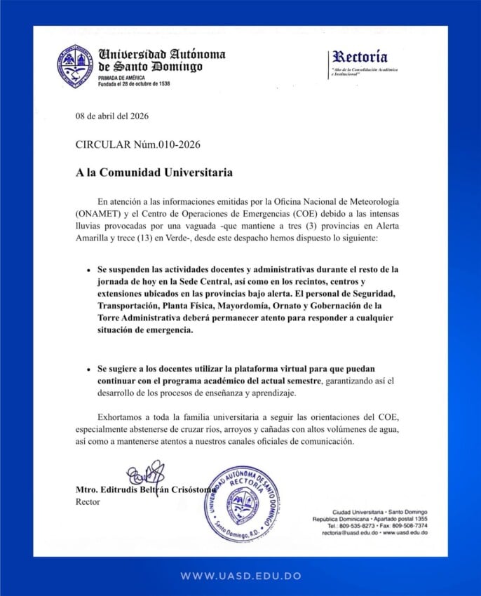La medida está contenida en la Circular Núm. 010-2026, emitida por la Rectoría, en atención a los reportes de la Oficina Nacional de Meteorología (ONAMET) y del Centro de Operaciones de Emergencias (COE), que mantienen varias provincias bajo alerta meteorológica.
