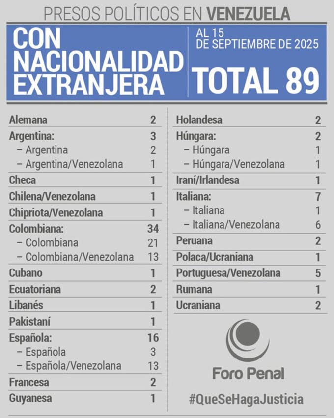 En el caso de venezolanos con doble nacionalidad, Foro Penal informó que hay 13 con ciudadanía colombiana, 13 con española, 6 con italiana, 5 con portuguesa, además de un chileno, un chipriota, un argentino y un húngaro. El informe también destaca dos casos singulares: una persona con nacionalidades iraní e irlandesa, y otra con pasaportes polaco y ucraniano, según datos publicados por el diario El Nacional de Venezuela.